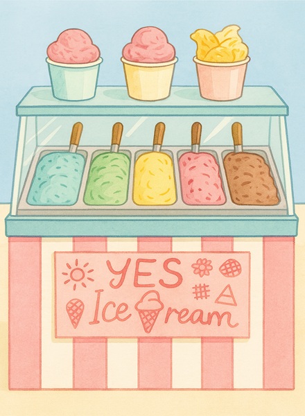 Bij dit knutselwerk zijn er diverse bekertjes met verschillende kleuren “ijs” gevuld en op de doos/toonbank geplaatst. Je kunt natuurlijk ook diverse bakken met ijs maken met behulp van kartonnen doosjes en verf of ook van gekleurd papier en daarachter of boven een paar bekertjes met ijs plaatsen. Zie bijvoorbeeld onderstaande schets.